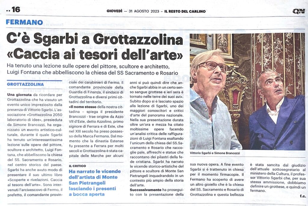 Il 29 agosto alle ore 19,00 per la comunità di Grottazzolina è stata una giornata da ricordare. Il Prof. Vittorio Sgarbi, attuale sottosegretario ai beni culturali, è stato presso la nostra chiesa parrocchiale del S.S. Sacramento. In questo contesto, il Professor Sgarbi ha eseguito un'analisi critica delle opere del Maestro Luigi Fontana, che affrescano la nostra stupenda Chiesa. Successivamente, il Professore ha presentato anche il suo nuovo libro "Scoperte e Rilevazioni".